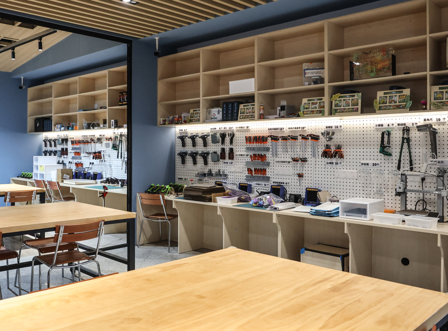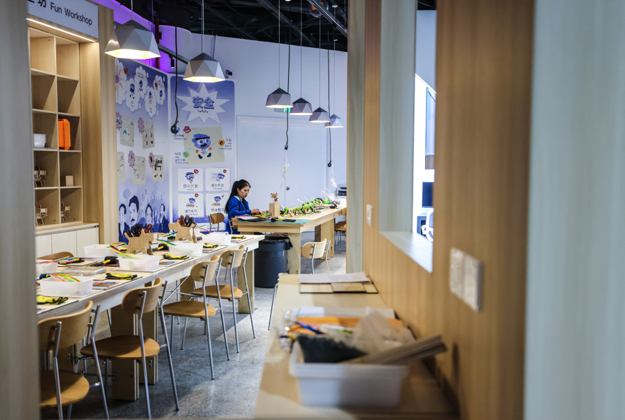 “明日科创营”位于上海科技馆B层,总面积约1300平方米,设计灵感来源于“裂变”与“聚变”的科学概念。其中,“裂变区”以明快的黄橙色象征思维发散,设有多个互动单元,鼓励自由探索;“聚变区”则以深邃蓝色营造专注氛围,聚焦知识整合与项目实现,支持从创意到作品的完整转化。空间内设有多件融艺术与科技于一体的互动装置,丰富探索体验。