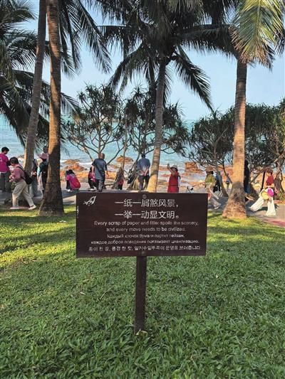 步道旁的草坪上,“一纸一屑煞风景,一举一动显文明”的提示牌温馨醒目。海滩边,游客踏浪、拍照,无人乱丢杂物。热门打卡点,大家互相礼让,依次拍照,文明有序。