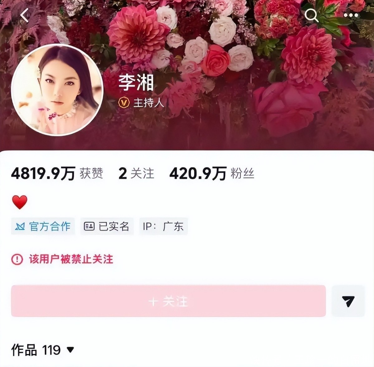 众所周知,今年1月16日,网友和媒体发现李湘的账号被平台禁止关注了。