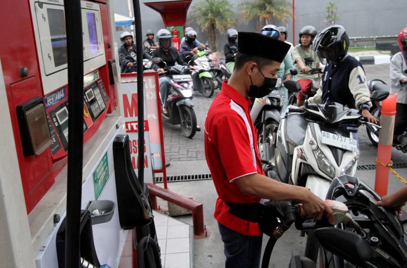 3月31日,在印度尼西亚梭罗,工作人员为摩托车加油。 新华社发(布拉姆摄)