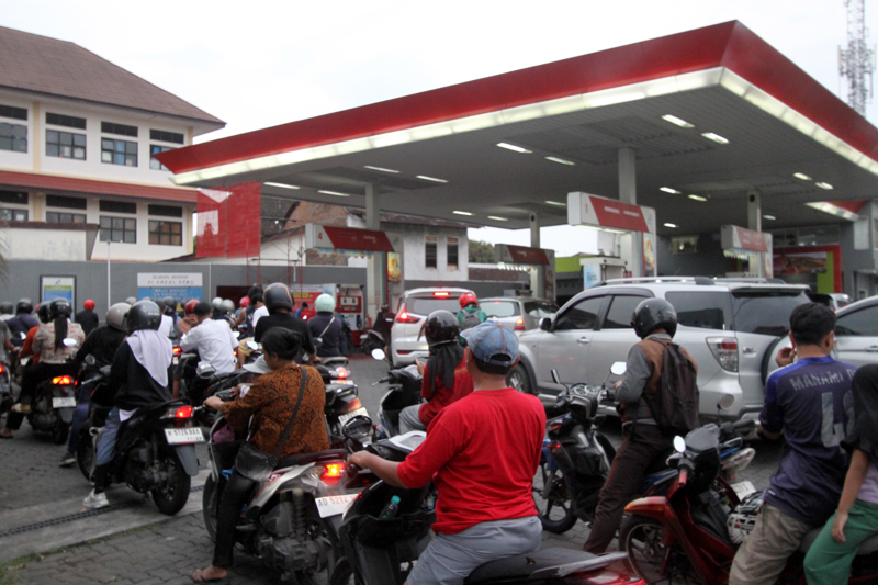 3月31日,人们在印度尼西亚梭罗一处加油站排队加油。 新华社发(布拉姆摄)