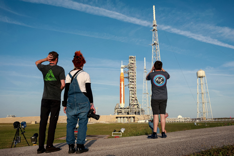 3月31日,在美国佛罗里达州肯尼迪航天中心,人们观看美国新一代登月火箭“太空发射系统”及其搭载的“猎户座”飞船。 新华社/路透