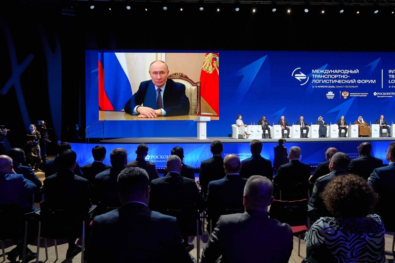 4月1日,在俄罗斯圣彼得堡举行的首届俄罗斯国际交通物流论坛上,俄罗斯总统普京发表视频致辞。新华社发(郭飞洲摄)