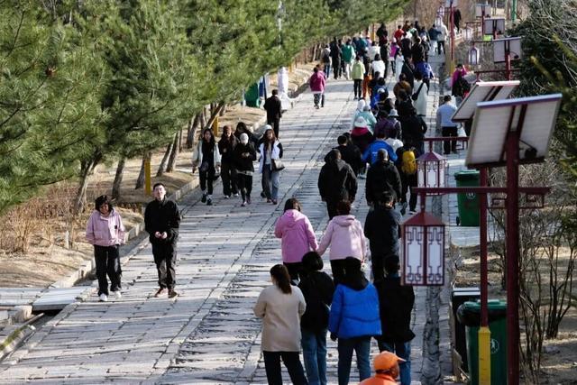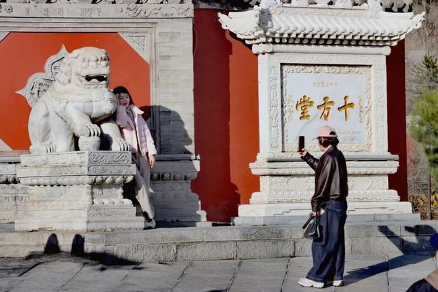 登高望远,山河入怀!在黛螺顶景点,青砖黛瓦的殿宇与苍松翠柏相映成趣,大批的游客沿1080级台阶拾级而上,站在山顶俯瞰台怀镇古建错落,在春日暖风中舒展身心,沉浸式感受万物复苏的春天景致。