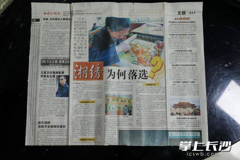 谈起与《长沙晚报》打过的交道,曾应明印象最深的是双方携手让湘绣“补录”进入第一批国家级非物质文化遗产保护代表作名录的故事。2005年,文化部启动名录申报,但在当年12月的公示名单中,“四大名绣”的苏绣、蜀绣、粤绣均入选,惟独少了湘绣。消息传来,在省内引发轩然大波,湘绣界纷纷发声鼓与呼,曾应明就是其中声量最大的那位。《长沙晚报》第一时间专访曾应明,发表了《湘绣为何落选?》一文,引发社会广泛关注。