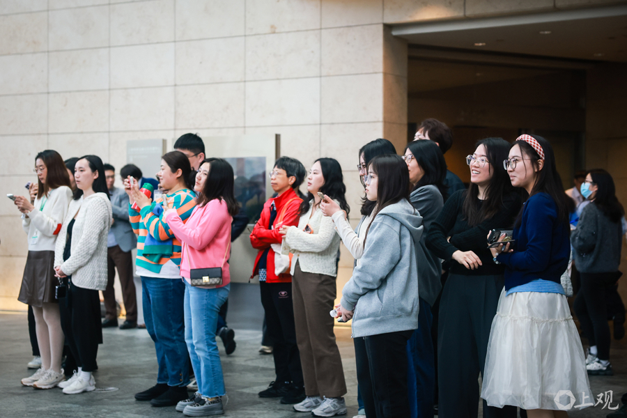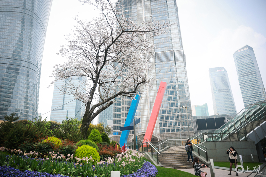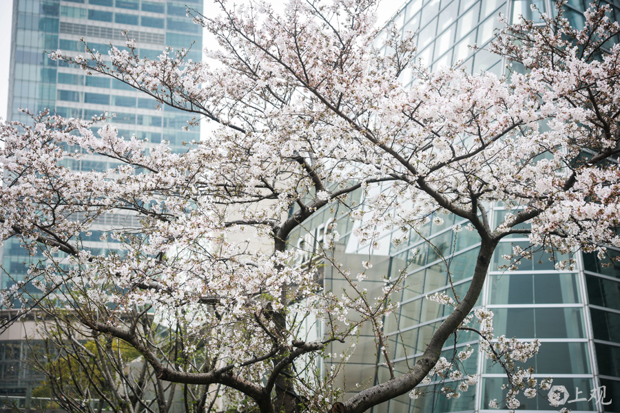 正值樱花盛放期,世纪大道与东泰路两侧12株染井吉野樱如绯云般绚烂,吸引众多市民游客驻足打卡,尽享申城春日浪漫。