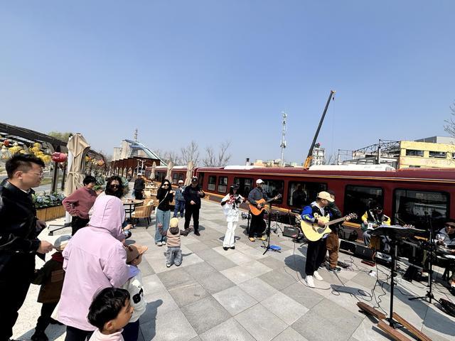 “永定河畔能散步也能发呆,这里太适合遛娃了!”赵晖带着孩子先到首钢园香格里拉大堂内逛非遗市集、看花式调酒秀,又来到户外花园和儿童乐园游玩,穿越永定河集后,一家人去了孩子心心念念的火车头餐厅,以火车头和新首钢大桥为背景拍下合影。午餐时分,户外一场乐队表演开始了,游客立马聚拢过来聆听,有人跟随着乐曲舞动身体,还有用餐客人也被吸引过来加入这场音乐派对。